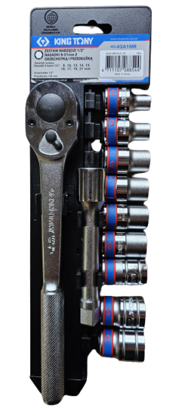 Zestaw nasadek 1/2″ 6-kątnych z grzechotką King Tony 43A1MR z plastikową zawieszką. Zestaw zawiera:- nasadki 6-kątne 1/2″ krótkie w rozmiarach: 8, 10, 13, 14, 15, 16, 17, 19, 21 mm, nasadki wykonane są ze stali chromowo-wanadowej, chromowane- grzechotka 1/2″ 32 zęby – 11°, wykonana z zestali chromowo-wanadowej, a jej napęd z ze stali chromowo-molibdenowej- przedłużka 1/2″ o długości 125 mm, wykonana ze stali chromowo-wanadowej
