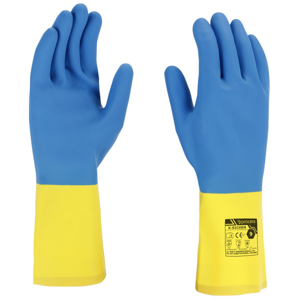 Rękawice X-BICHEM to rękawice lateksowe z dwukolorowym wykończeniem, zapewniającym wyjątkową chwytność i odporność na ścieranie. Rękawice są elastyczne, lekkie i wygodne w noszeniu dzięki flokowanemu wykończeniu. Rękawice są odporne na chemikalia i przeznaczone do pracy w środowisku mokrym lub zaolejonym. Rękawice mają długość 300 mm. Każda para jest pakowana w woreczek z możliwością zawieszenia. Rękawice występują w rozmiarach 7, 8, 9, 10. Posiadają certyfikaty CE, EN ISO 21420, EN 388:2016+A1:2018 2120X , EN ISO 374-1:2016+A1:2018/Type A AKLMNO i EN ISO 374-4:2019 , EN ISO 374-5:2016
