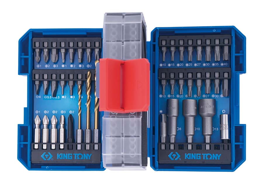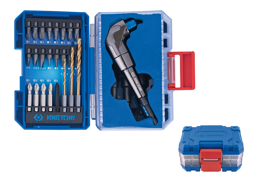 Zestaw akcesoriów 1/4″ do wkrętarki z adapterem kątowym King Tony 45 elementów.